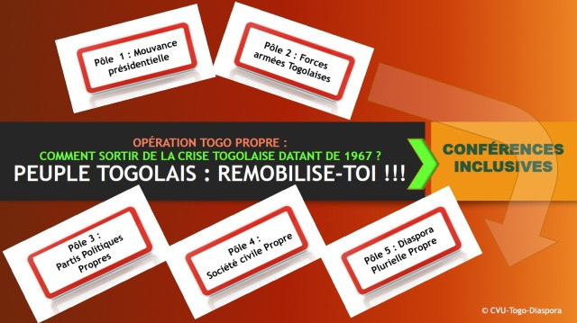 Les membres du RCDTI et du CVU-TOGO-DIASPORA et leurs sympathisants rappellent au Peuple togolais que la Diaspora togolaise plurielle et indépendante invite les pôles 3, 4 et 5 (partis politiques, société civile et Diaspora plurielle) qui constituent les pôles de l’alternative citoyenne et de l’alternance politique à :