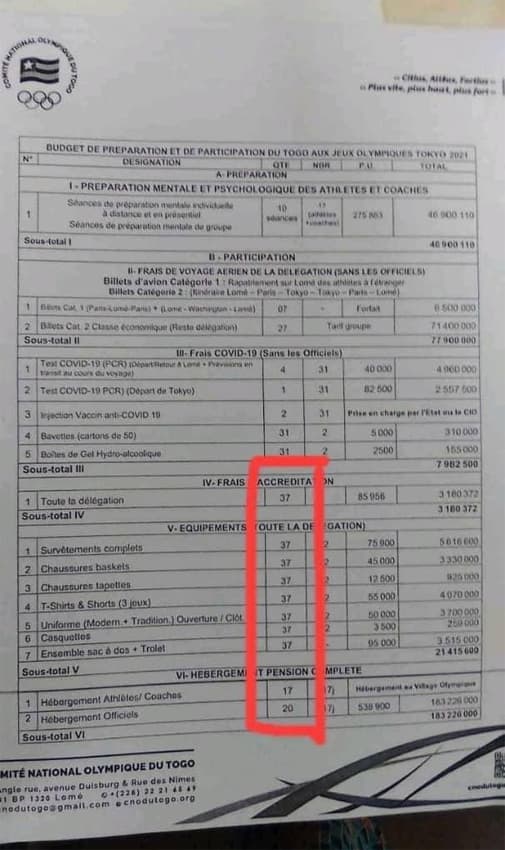 Depuis quelques jours circule sur la toile et sur toutes les plateformes un document portant « Budget de préparation et de participation du Togo aux Jeux Olympiques de Tokyo 2021 ». Sur ce document, concernant le nombre de personnes composant la délégation togolaise à Tokyo, il est fait mention de 37 participants dont 20 officiels, 5 athlètes et 12 entraineurs.
