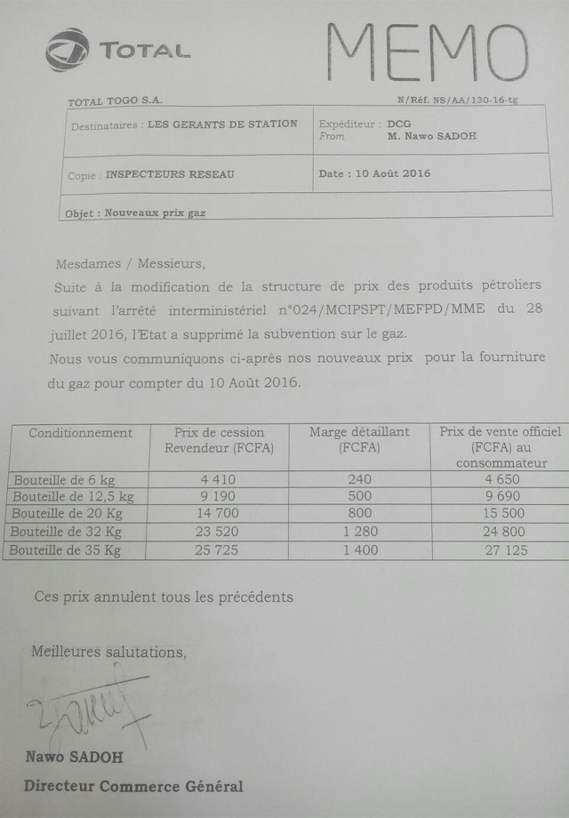 © togoactualite – Le prix du gaz vient d’être revu à la hausse à compter de ce 10 Août 2016 au Togo. C’est ce que laisse entrevoir une note de la direction de Total Togo à l’intention des détaillants. Cette augmentation selon la note est motivée par la suppression de la subvention par l’Etat.