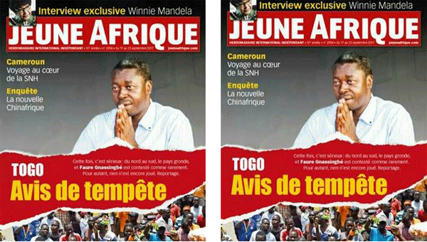 Cette photo, au-dessus d’une autre représentant une mêlée de manifestants anonymes qui agitent des petits drapeaux togolais, les deux séparées par le titre « Avis de tempête », figure en couverture de l’édition Afrique subsaharienne du dernier numéro de JA. Si le contenu est le même, les unes de notre hebdomadaire varient en effet en fonction des zones géographiques de distribution.