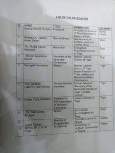 La délégation était composée de Catholiques (Mgr Benoît Alowonou, Président de la Conférence des Evêques du Togo ; Mgr Nicodème Barrigah, Président de la Commission Vérité, Justice et Réconciliation), de Protestants (Dr Akotia Daniel Mawussi, Modérateur de l’Eglise Evangélique Presbytérienne du Togo), de Méthodistes (Révérend Godson Lawson Kpavuvu, Ancien Secrétaire général de l’Eglise Méthodiste du Togo, Dr Prosper Comla Deh, Responsable œcuménique du Togo).