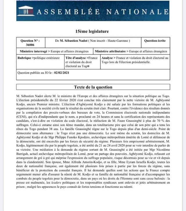 @togoactualite.com – Sébastien Nadot, parlementaire français, a dans un courrier, interrogé le ministre français des affaires étrangères, Jean-Yves le Dryan sur la situation politique togolaise.