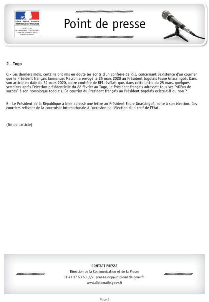 « Le Président de la République a bien adressé une lettre au Président Faure Gnassingbé, suite à son élection. Ces courriers relèvent de la courtoisie internationale à l’occasion de l’élection d’un chef de l’État », lit-on dans le communiqué sanctionnant le point de presse.