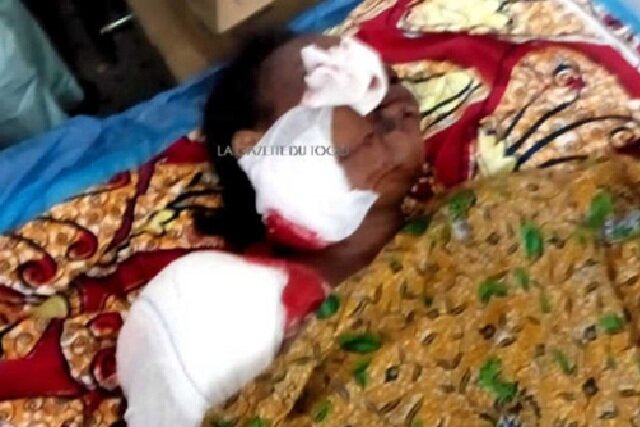 Moïse, un jeune garçon de la trentaine, a reçu un coup de crosse sur la tête comme le témoigne cette photo. Il doit être suturé à la tête. La dernière blessée, Afiwa PASSAH, 38 ans, est restauratrice dans la cafétéria proche de l’endroit où le jeune gendarme était en poste. Elle aussi reçu de balles à la figure et à l’épaule comme le témoigne sa photo bandée au visage.