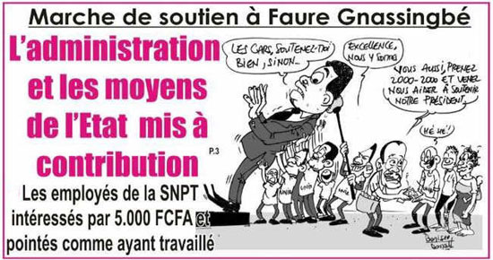 Non seulement les tee-shirts sont confectionnés avec son effigie, mais une somme de 5000 FCFA a été allouée à chaque militant pour participer au défilé. Même les hommes en tenue se sont déguisés en militants du parti au pouvoir. Le Premier ministre et tout son gouvernement étaient en tête des cortèges. Le prédisent de la Cour constitutionnelle, dernier recours en cas de contentieux électoral, a bafoué l’article 103 de la constitution , pour se transformer en militant , aller sauter et danser dans les rues , en hurlant au milieu des manifestants « vive Faure GNASSINGBE ».