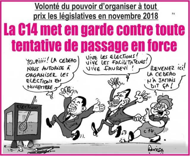 Le régime frauduleux de Faure Gnassingbé se lance une fois encore dans des mensonges en tordant le cou au communiqué des soi-disant facilitateurs de la CEDEAO pour tenter d’imposer par la force des élections frauduleuses aux Togolais en novembre 2018 | Caricature : Donisen Donald / Liberté